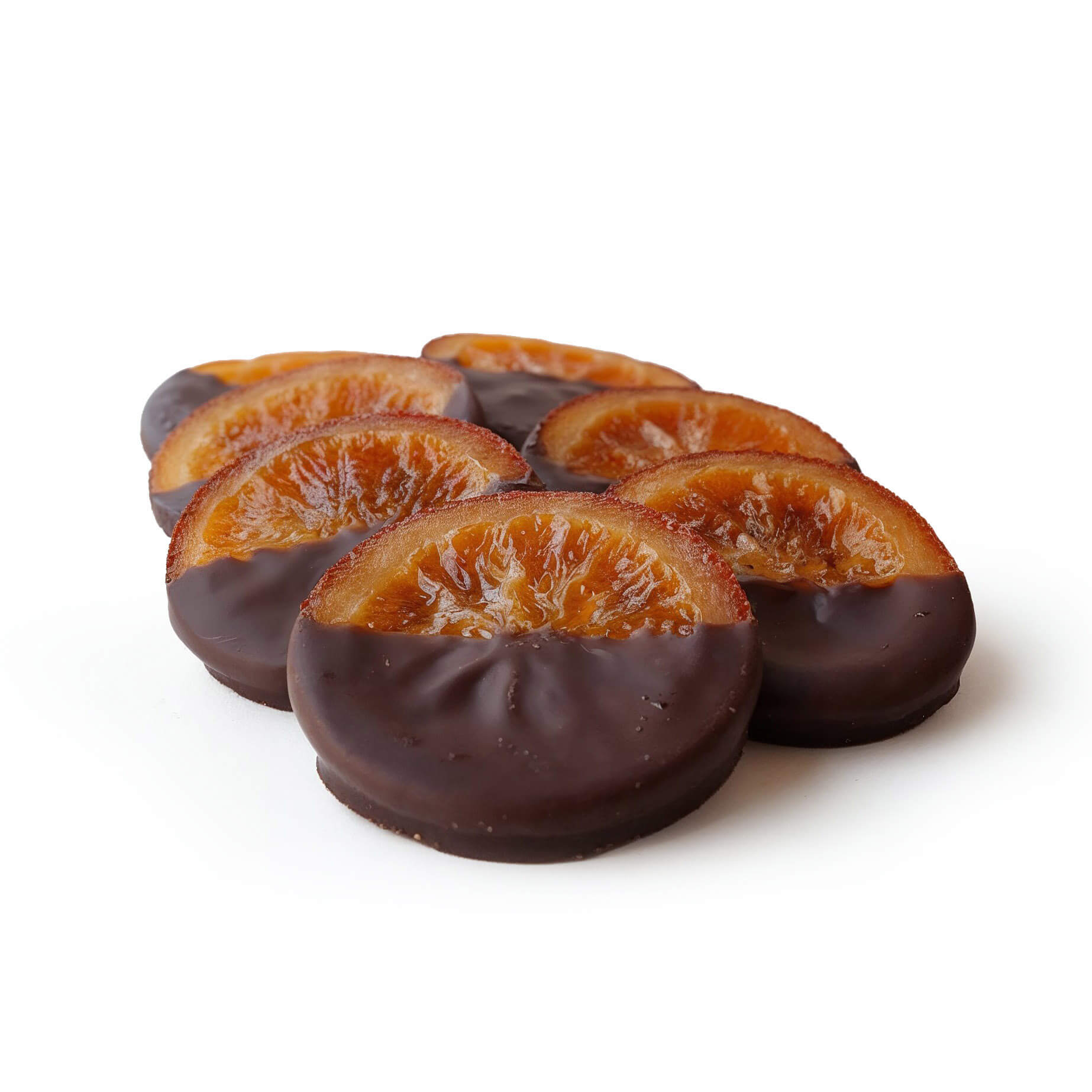 Gekonfijte sinaasappel schijven met pure chocolade in cadeauverpakking.
