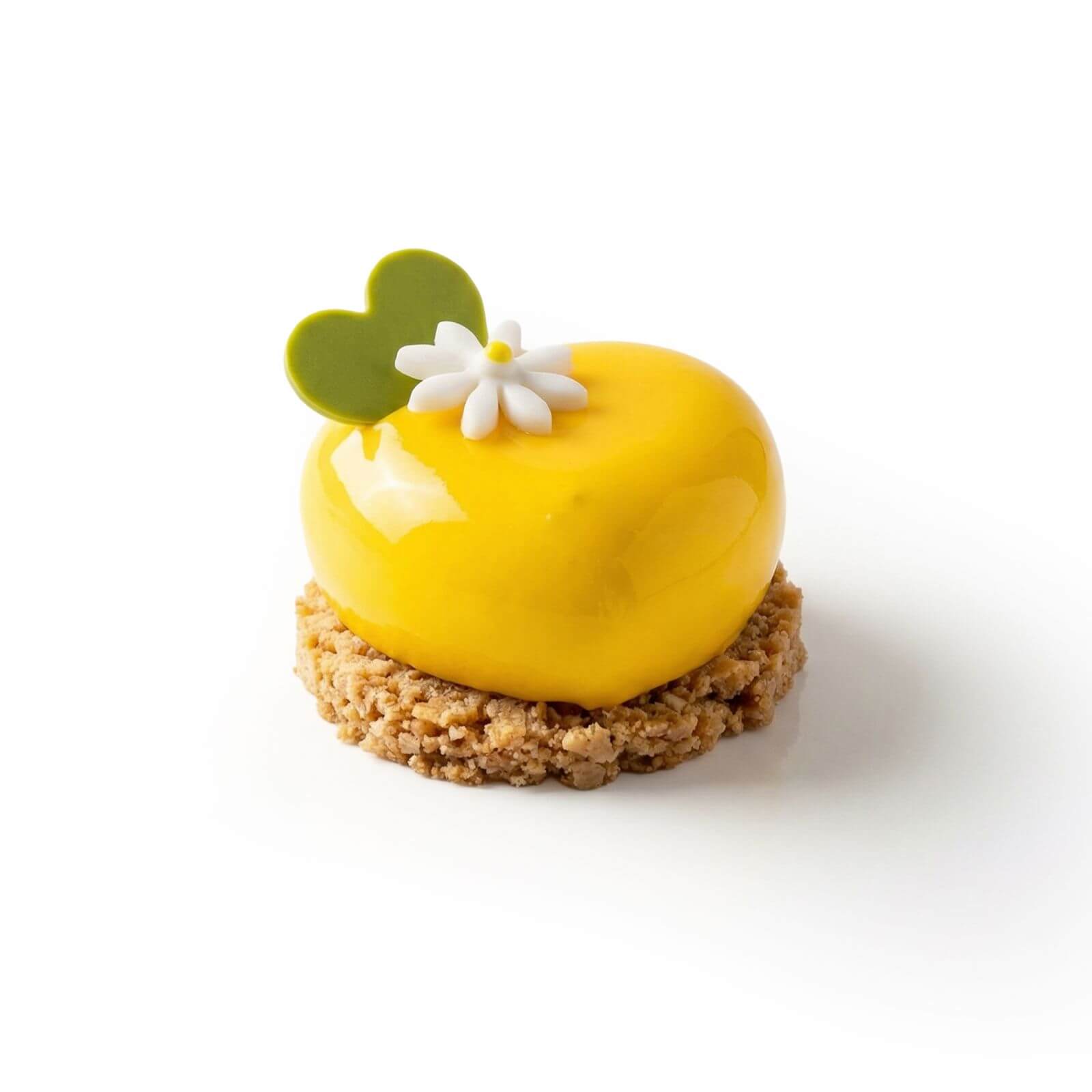 Witte chocolade mousse, passievrucht cremeux, biscuit en een krokante koekbodem van feuilletine, witte chocolade en koekkruimels