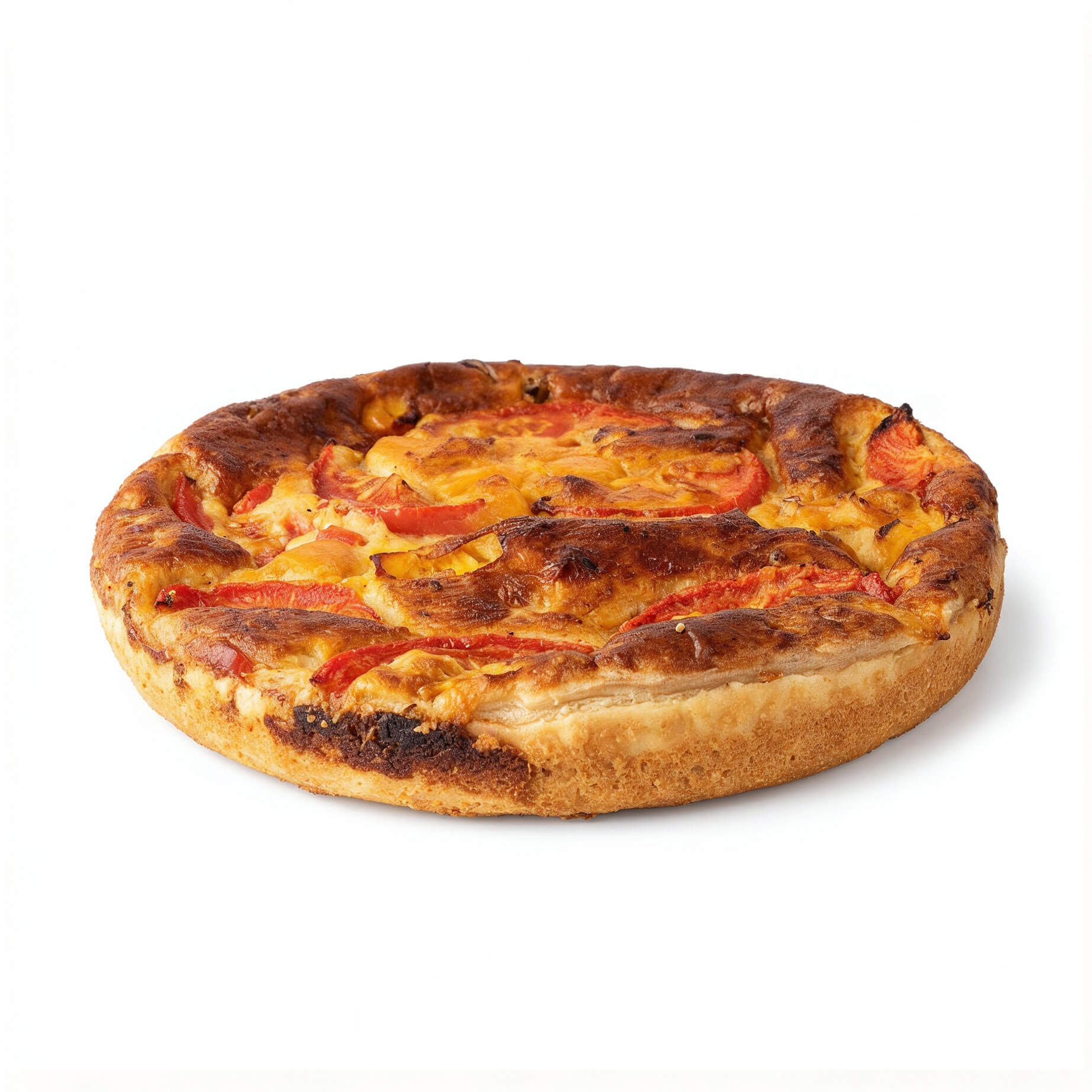 Quiche gevuld met oude kaas, ui, paprika, courgette en tomaat.